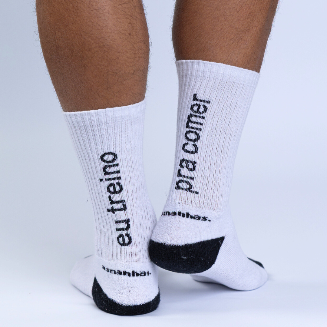 Meias "Eu Treino Pra Comer" Brancas – Asmanhas Adicione uma pitada de humor ao seu...