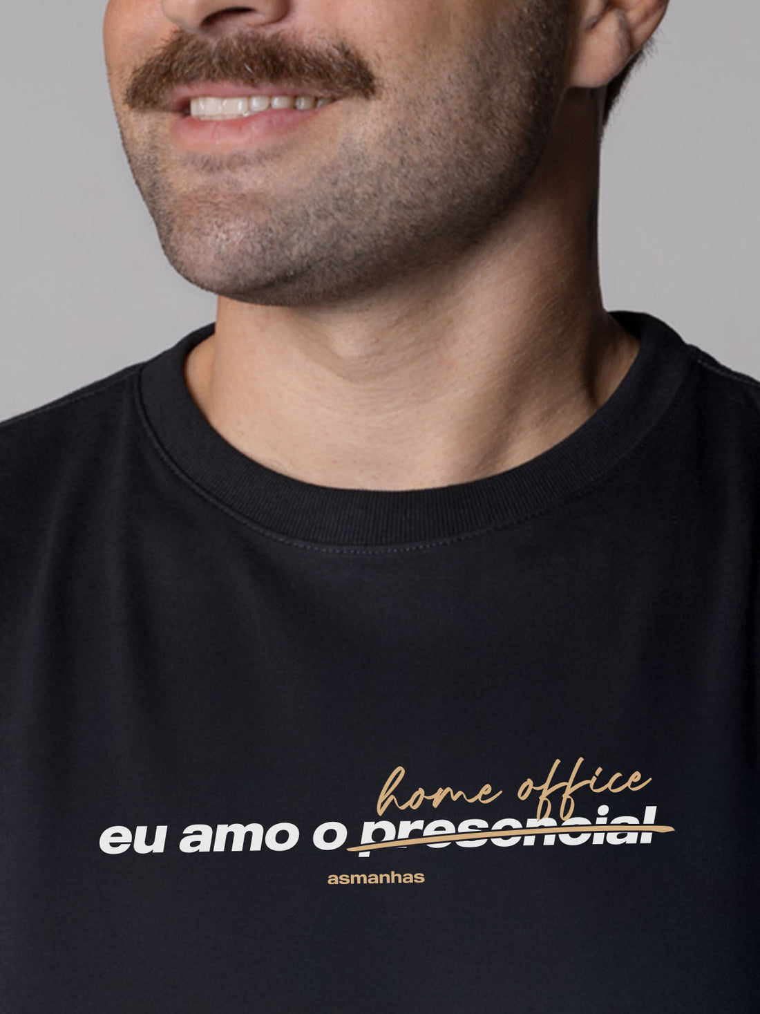 Camiseta Masculina Eu amo o presencial (Home Office) Presencial? Só se for no cafezinho da...