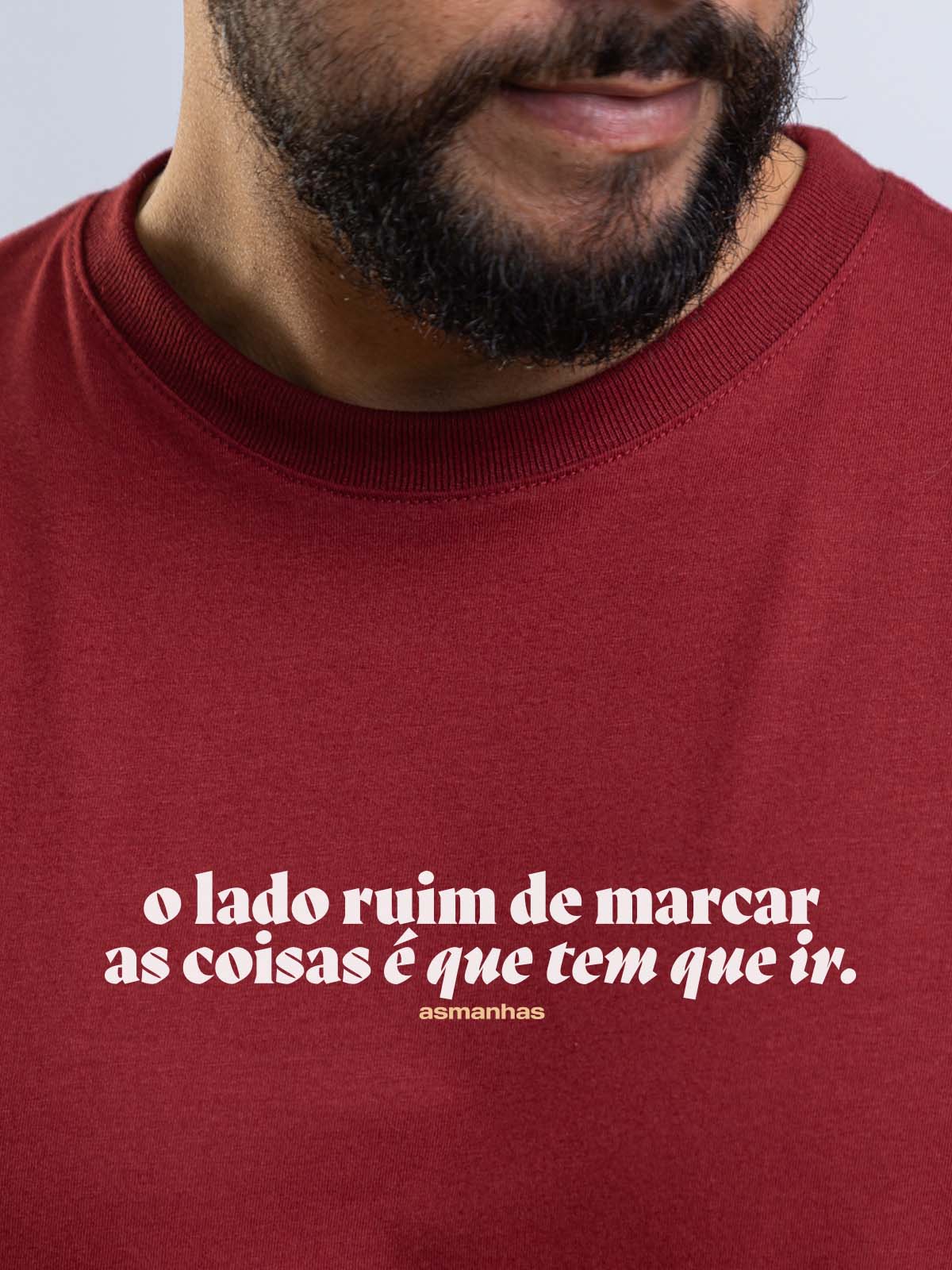 Marcar é fácil, o problema é quando a data chega. Essa camisa é pra quem ama planejar o rolê, mas na hora H queria mesmo era estar no sofá descansando. Perfeita pra deixar o recado com humor, sem precisar inventar desculpa.