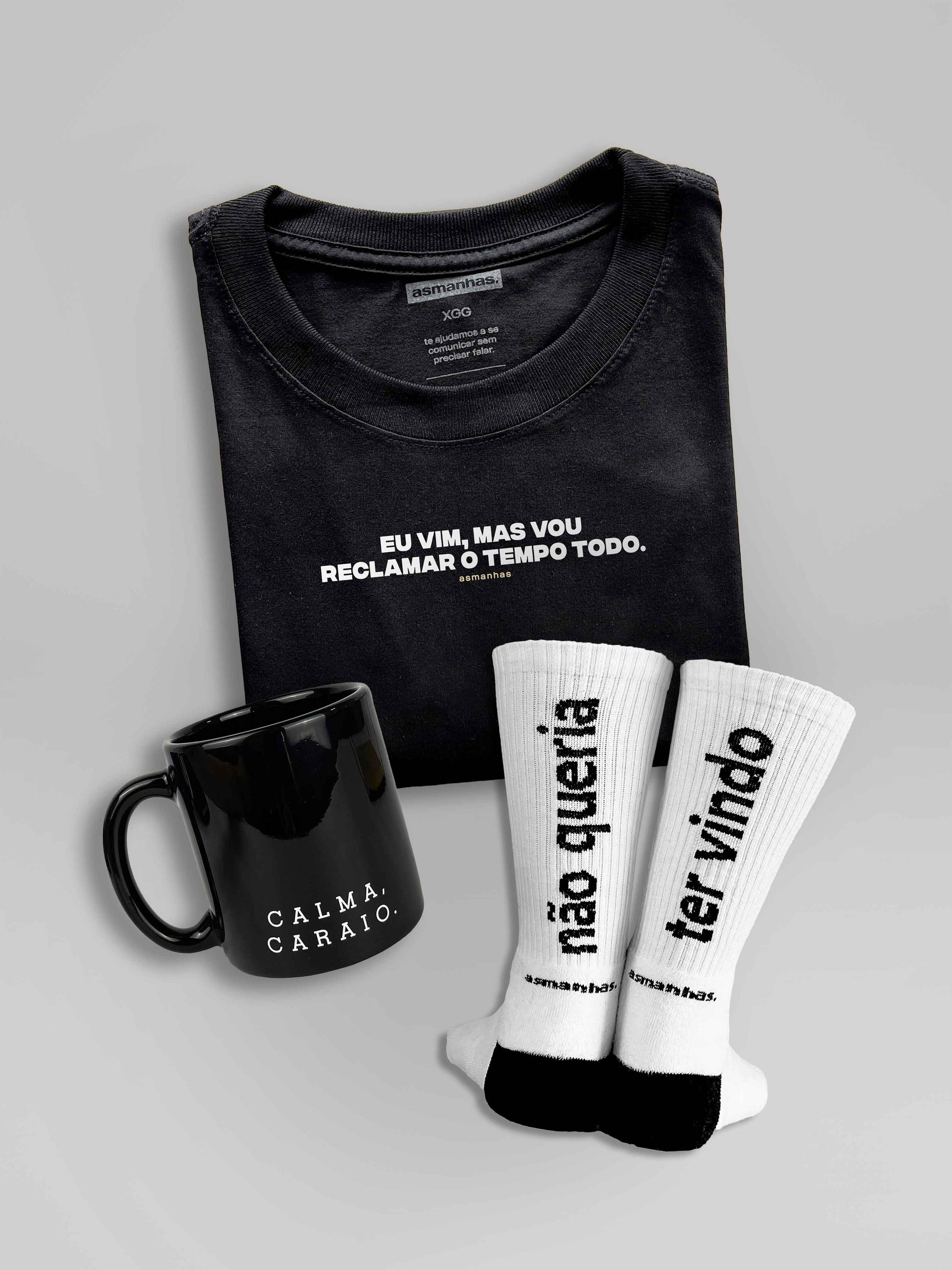 Com esse kit você acerta em cheio: 1 camiseta, 1 caneca e 1 par de meias, todos escolhidos por você.